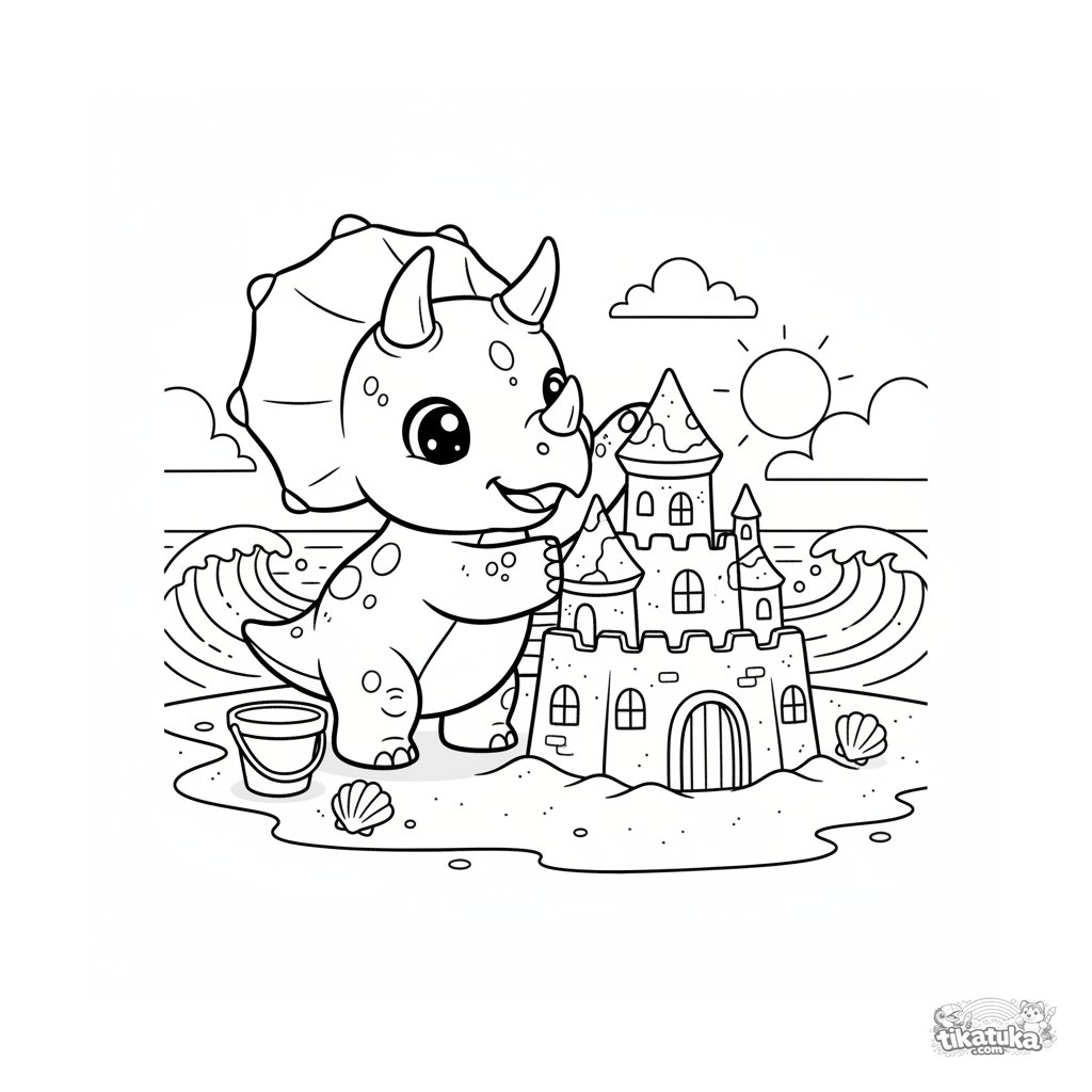 Página para colorir para crianças de 4-6 anos: um jovem tricerátope constrói um castelo de areia em uma praia oceânica antiga. Cena divertida, detalhe moderado, expressão fofa.