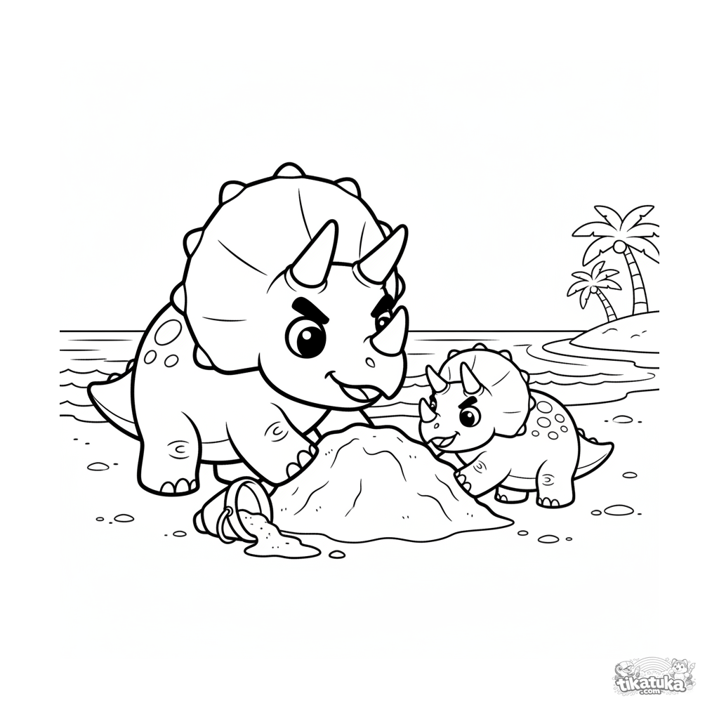 Página para colorir para 7-9 anos: uma família de tricerátopes constrói um monte de areia na praia de um oceano antigo. Cena cooperativa em estilo de desenho animado clássico.