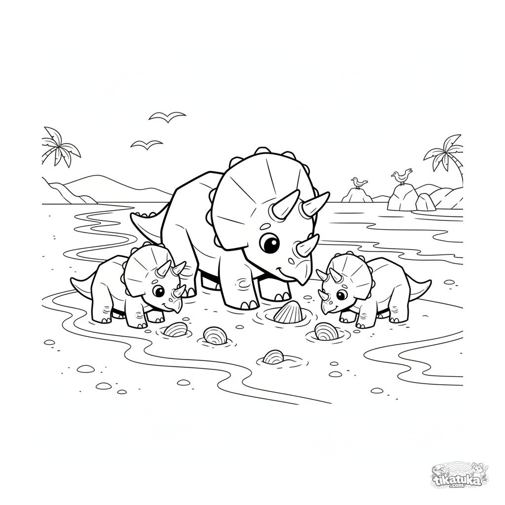 Página para colorir para crianças 4-6: uma família de tricerátopes procura mariscos na areia molhada de uma praia oceânica antiga.
