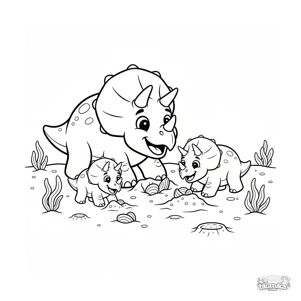 Página para colorir para crianças 7-9: uma família de tricerátops cava em busca de moluscos em uma praia oceânica antiga na maré baixa. Cena familiar dinâmica, corpos inteiros.