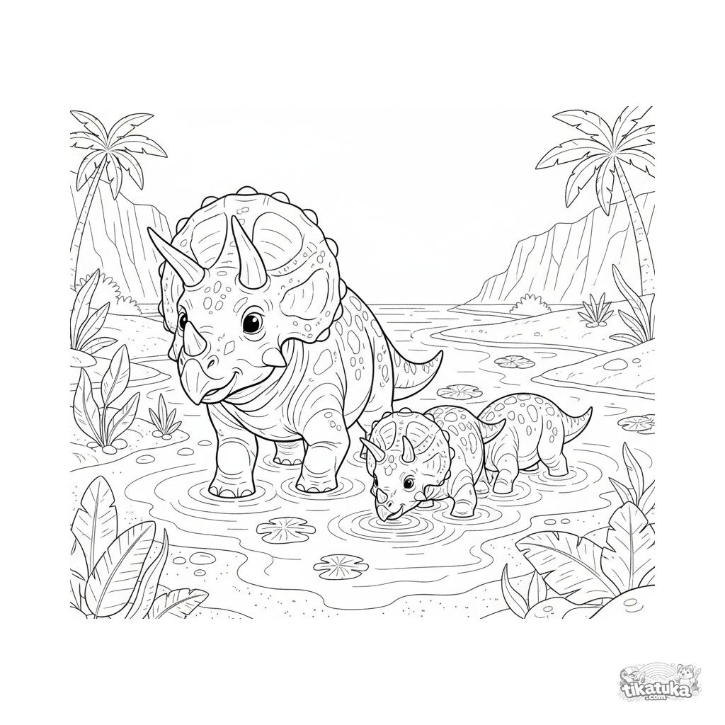 Página realista detalhada para colorir de uma família de tricerátopes atravessando uma lagoa rasa em uma praia antiga. Para crianças de 10-12 anos. Cena com múltiplos personagens.