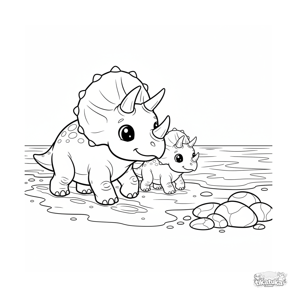 Página para colorir para crianças 4-6: uma família de tricerátopes faz um passeio tranquilo pela costa de um oceano antigo. Cena familiar aconchegante em estilo de desenho clássico.