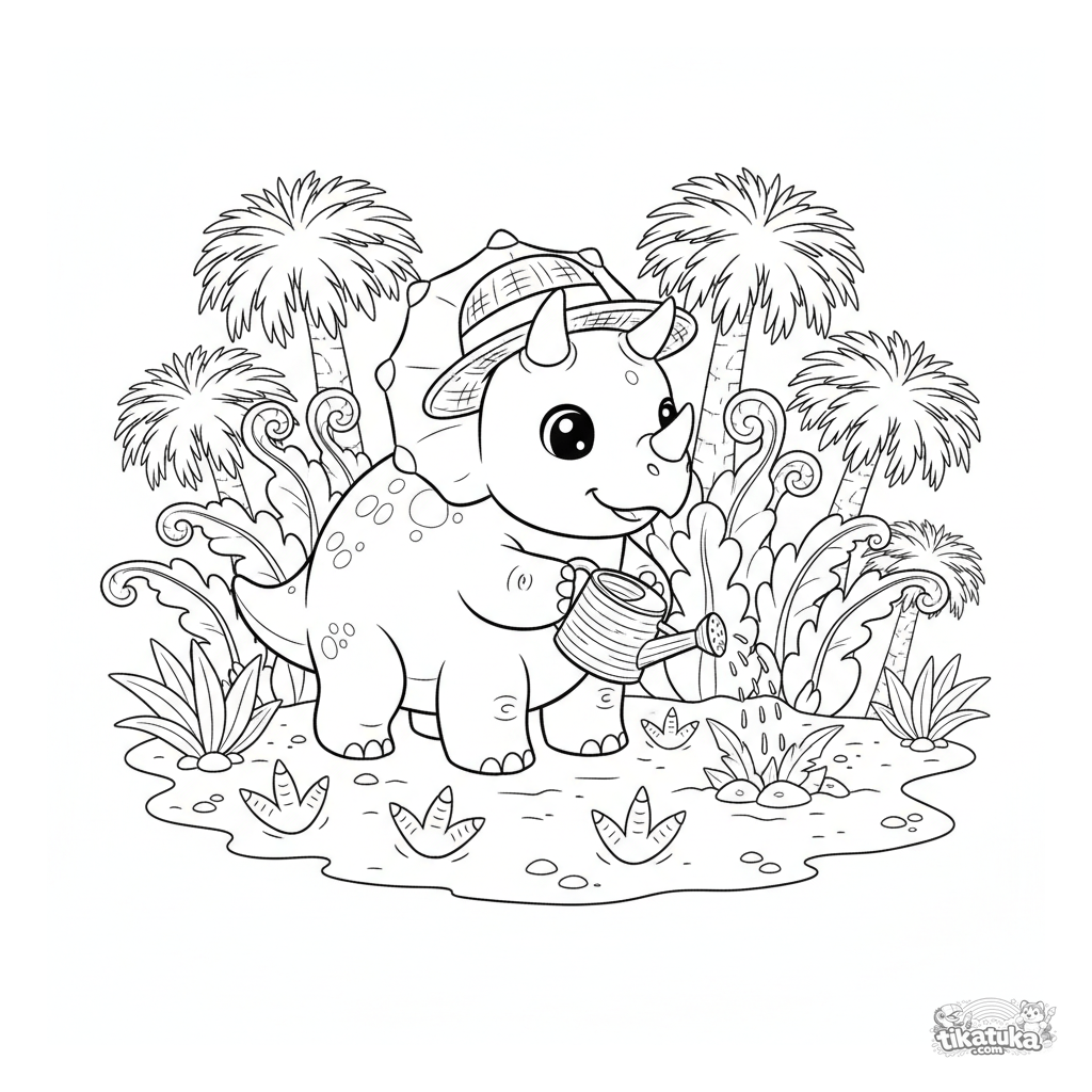 Página para colorir para crianças de 4-6 anos: um fofo tricerátope jardineiro com chapéu regando samambaias pré-históricas. Cena simples e amigável.