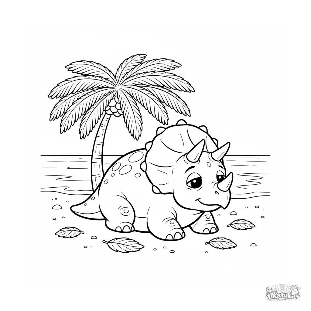 Página para colorir para crianças de 4-6 anos: um grande tricerátops descansa à sombra de uma planta semelhante a uma palmeira na praia de areia de um oceano antigo. Uma cena calma e pacífica.
