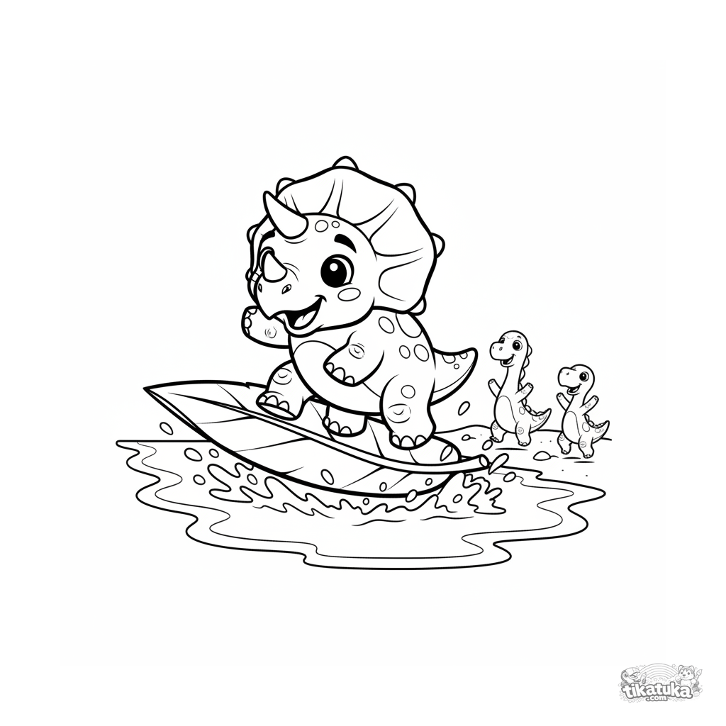 Página para colorir divertida para crianças 4-6: um jovem triceratops tenta manter o equilíbrio surfando em uma folha grande perto da costa de um oceano antigo. Cena dinâmica e engraçada.