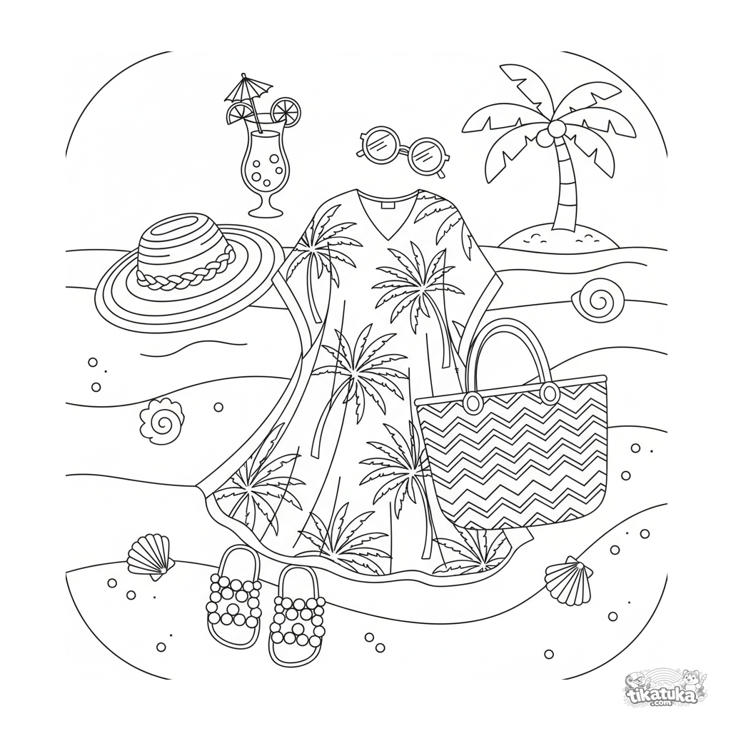 Página para colorir para 10-12 anos: uma roupa de praia tropical sobre a areia. Inclui chapéu largo, caftan, sandálias e acessórios de verão com fundo marinho.