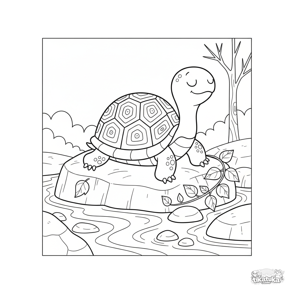Página para colorir para crianças de 4-6 anos: uma tartaruga aconchegante tomando sol em uma pedra quente perto de um riacho. Formas suaves e arredondadas.