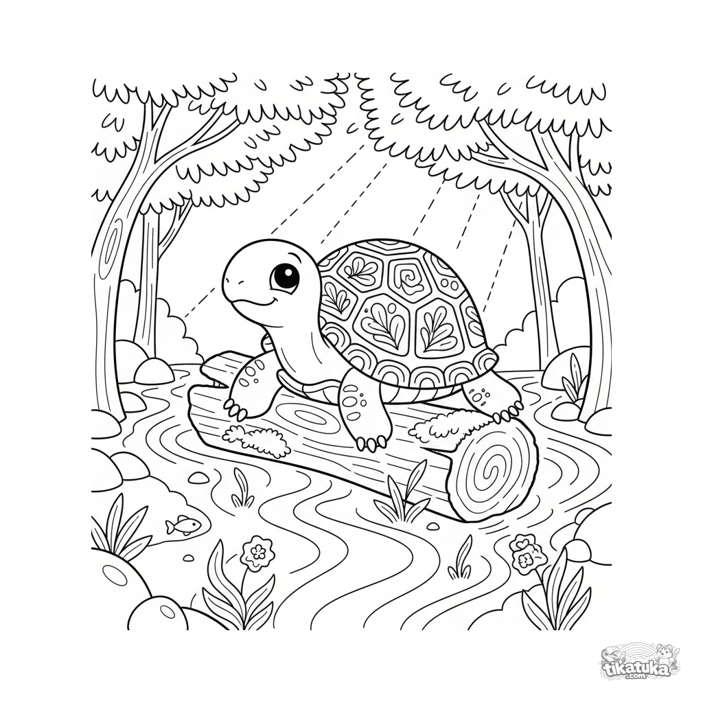Página para colorir para crianças de 4-6 anos no estilo de gravura popular: uma pequena tartaruga descansa confortavelmente em um tronco submerso em um riacho, tomando sol.
