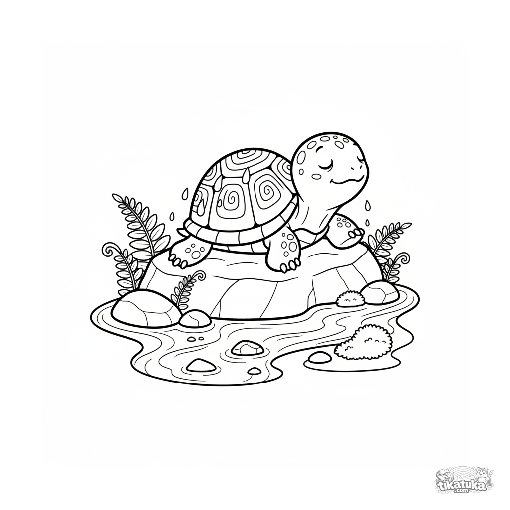 Página para colorir para crianças 4-6: uma pequena tartaruga com casco padronizado tomando sol numa pedra lisa junto a um riacho murmurante.