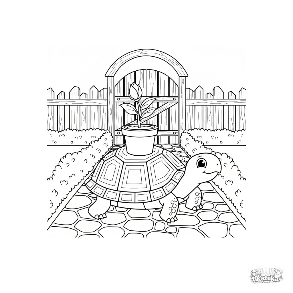 Página para colorir crianças: uma tartaruga fofa carrega um pequeno vaso de flor por um caminho de pedra em um jardim. Cena simples mas detalhada com contornos claros.