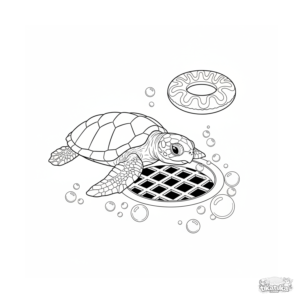 Página detalhada para colorir para crianças de 10-12 anos: um filhote de tartaruga com casco padronizado investiga a grade do ralo da piscina, com um anel inflável flutuando acima. Linhas realistas.