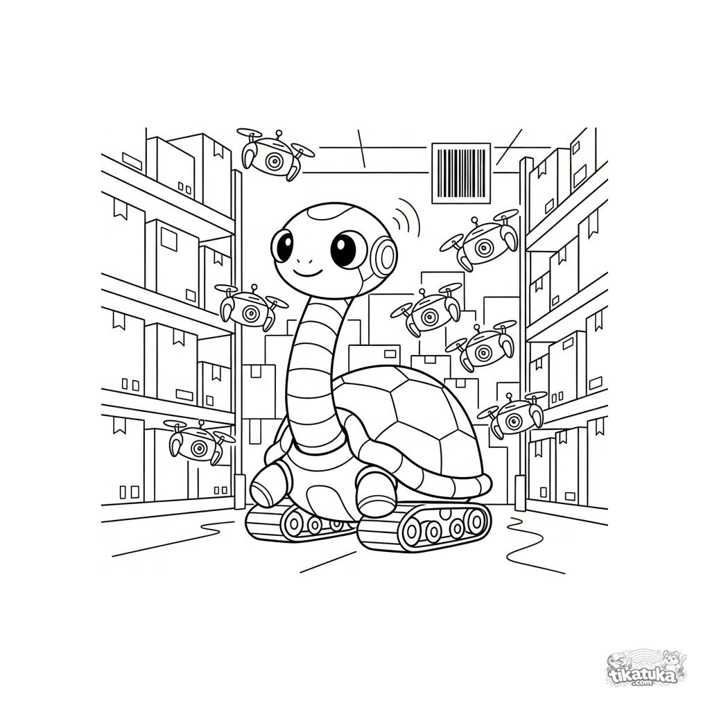 Página para colorir para crianças de 4-6 anos: um robô tartaruga fofo inspecionando um armazém entre caixas e drones. Imprima e pinte o inspetor do futuro!