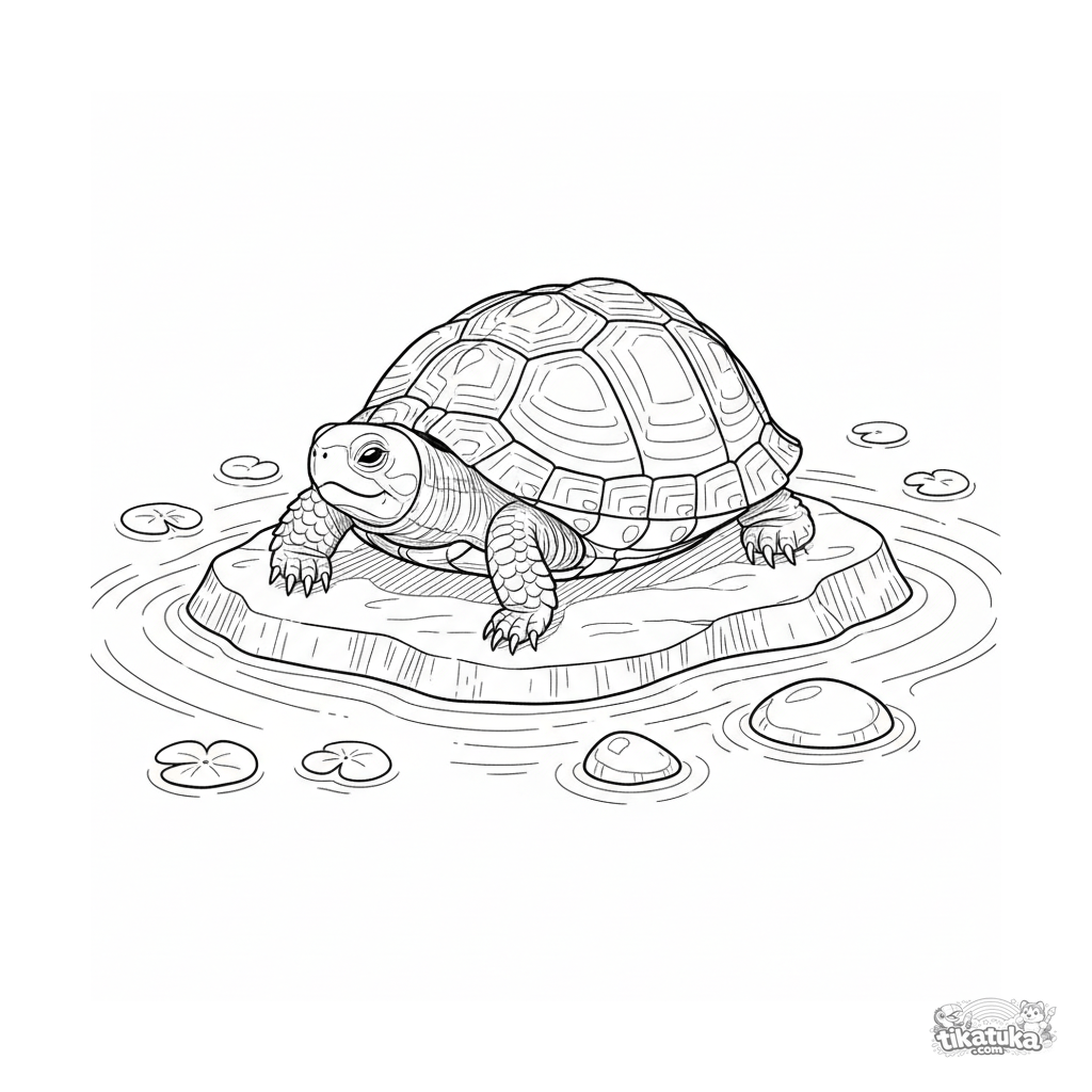 Página para colorir detalhada para crianças mais velhas de 10-12 anos: uma tartaruga toma sol numa pedra quente no meio de um riacho claro. Cena de paz na natureza em estilo gravura.