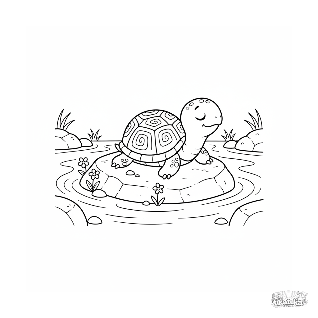 Página para colorir para crianças 4-6: uma pequena tartaruga toma sol em uma pedra quente perto de um riacho. Formas planas simples, padrão da casca, flores silvestres.