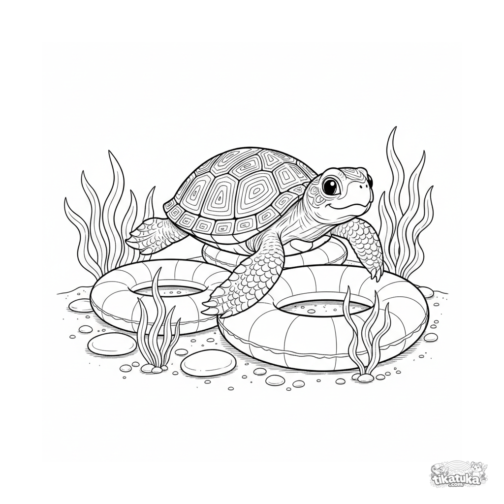 Página detalhada para colorir para crianças de 10-12 anos: uma tartaruga nada através de anéis infláveis no fundo da piscina. Cena com movimento e textura.