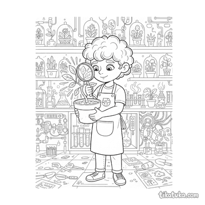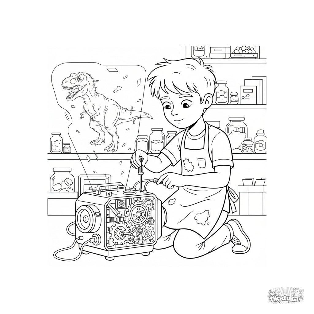 Página para colorir para pré-adolescentes 7-9: um menino inventor em um laboratório secreto consertando um projetor de holograma com imagem de dinossauro. Ferramentas e componentes detalhados.