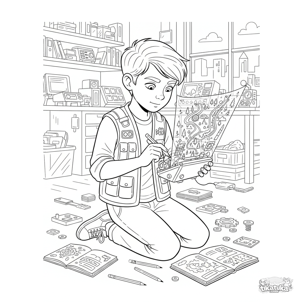 Página para colorir para pré-adolescentes 7-9: um jovem inventor conserta um projetor de mapa holográfico em um laboratório secreto.