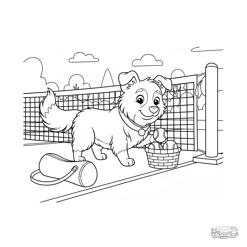 Página para colorir para crianças de 7-9 anos: um cachorro inteligente ajuda a coletar bolas de tênis na quadra. Cena estilo Disney, emoções expressivas, detalhes do ambiente.