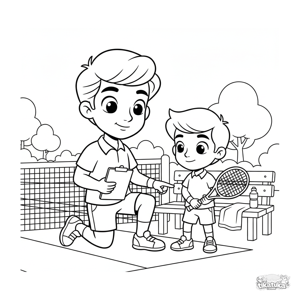Página para colorir para crianças de 7-9 anos: um treinador de tênis explica a técnica para um jovem jogador. Cena sobre aprendizado e apoio.
