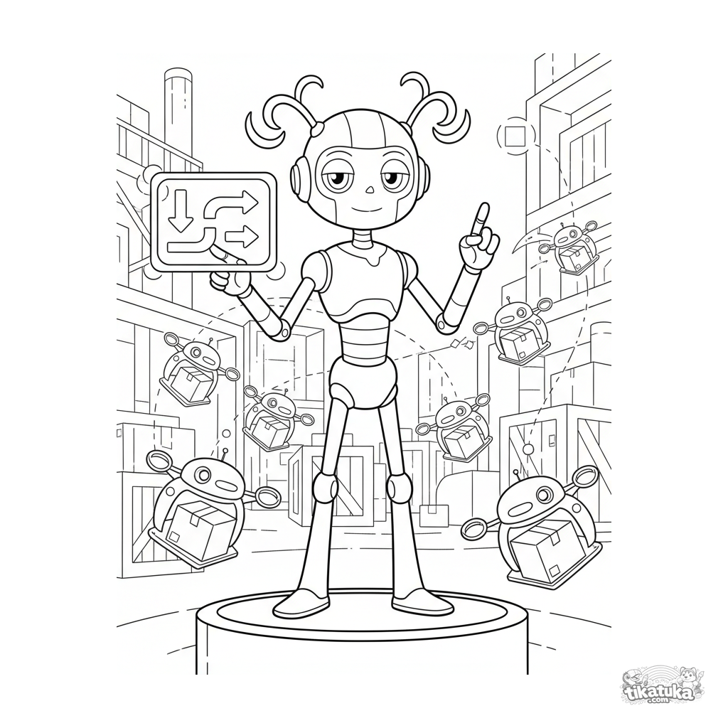 Página para colorir de um robô supervisor dirigindo drones por uma tela holográfica em um armazém. Para crianças de 7 a 9 anos.