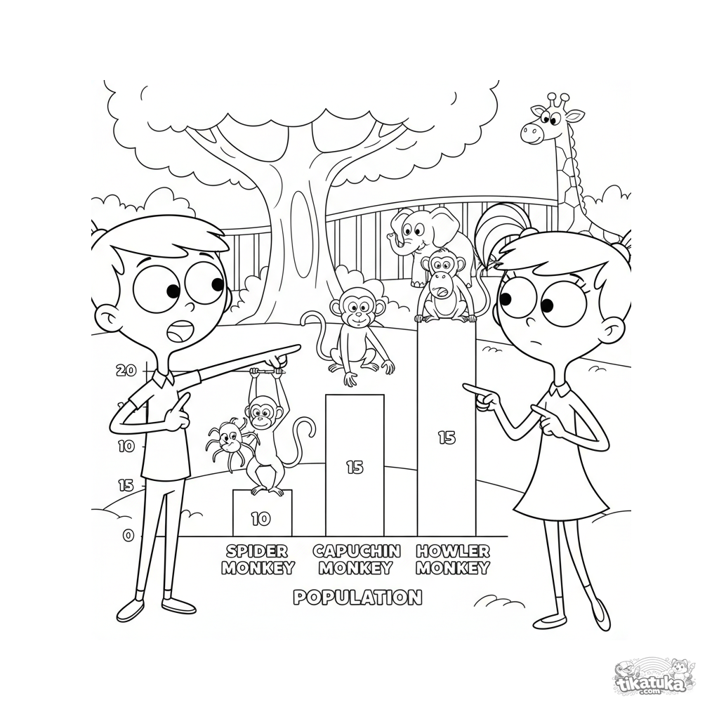 Página para colorir para 7-9 anos: gêmeos estudam um gráfico de barras colorido mostrando a população de diferentes espécies de macacos no zoológico. Cena educacional combinando matemática e zoologia.