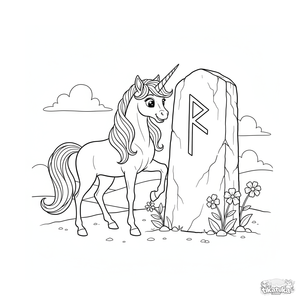 Página para colorir para crianças de 7-9 anos: uma graciosa potra de unicórnio usa seu chifre para traçar runas brilhantes em um antigo monólito. Cena que mistura realismo e conto de fadas.