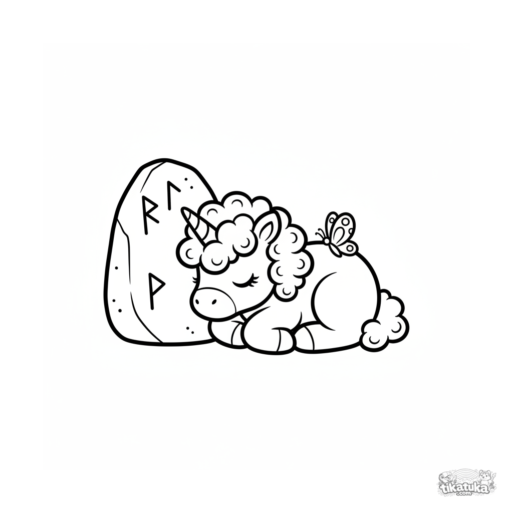 Página simples para colorir para os mais pequenos: um potro de unicórnio de pelúcia dorme encostado a uma pedra rúnica antiga.