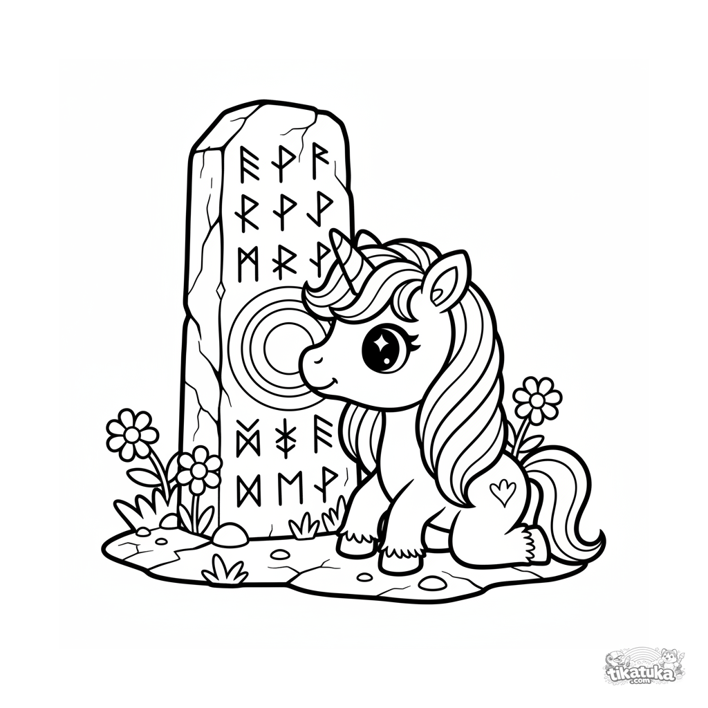 Página para colorir para crianças pequenas: um potro de unicórnio minúsculo admira uma runa brilhante na base de um monólito. Formas simples e grandes, margens amplas.