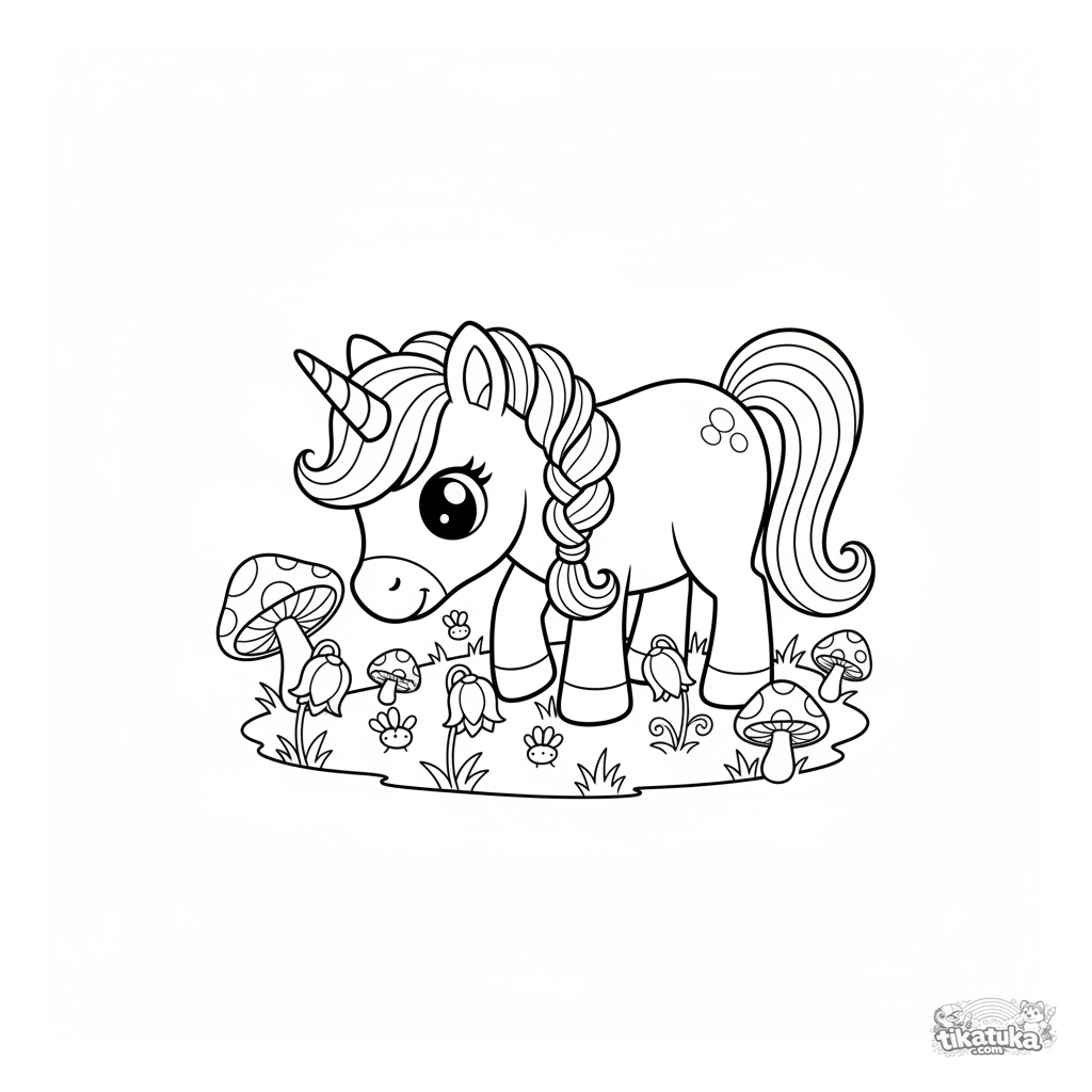 Página para colorir para meninas 4-6: um gracioso pônei unicórnio com crina trançada pasta em um prado encantado com cogumelos brilhantes e flores de sino. Cena de conto de fadas.