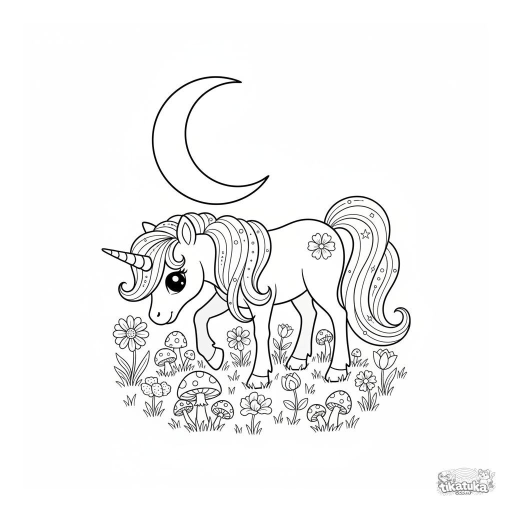Página para colorir difícil de um pônei unicórnio mágico pastando num prado ao luar. Para crianças de 8 a 12 anos. Cena detalhada com flores noturnas e cogumelos brilhantes.
