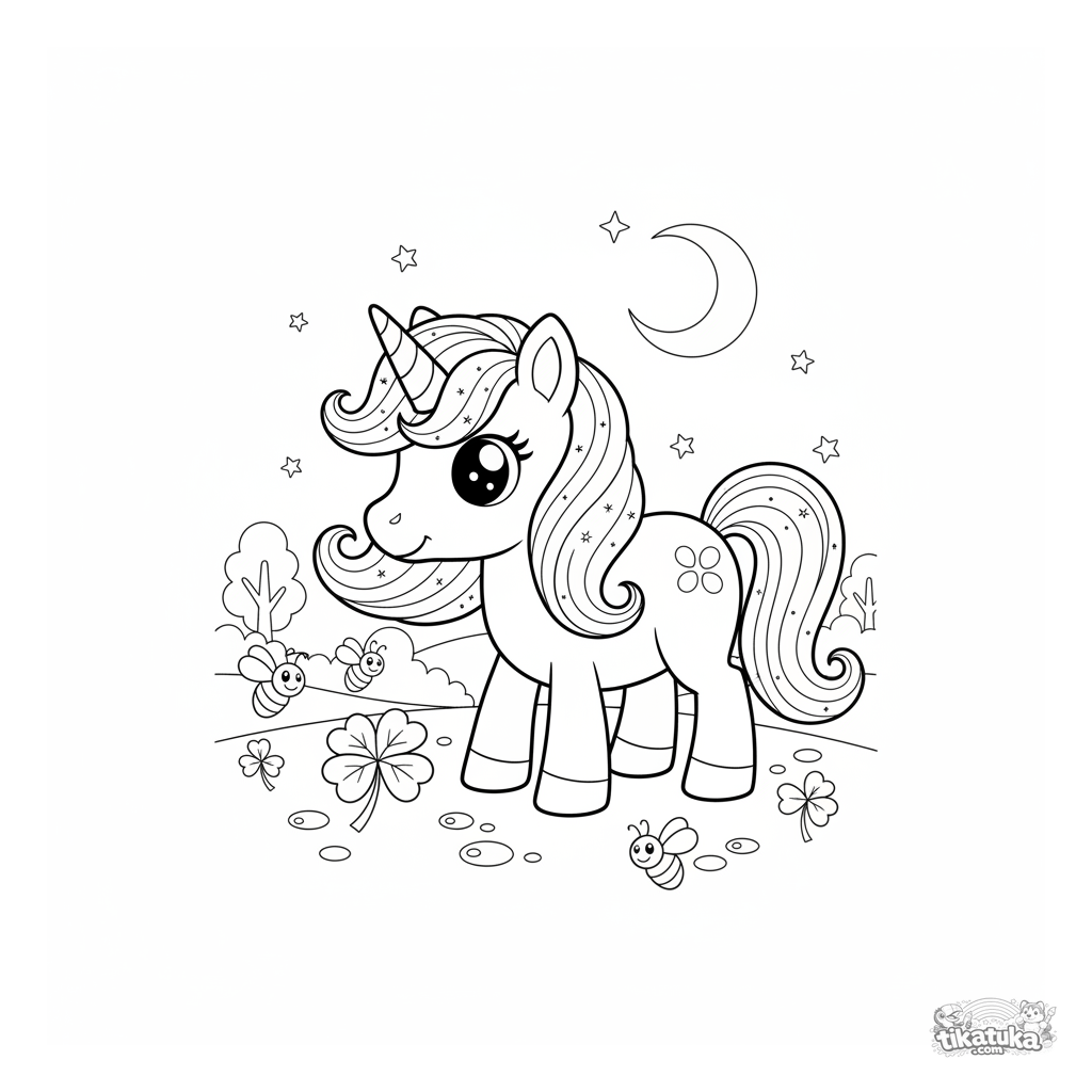 Página mágica para colorir para meninas de 4-6 anos: um pônei unicórnio pasta num prado ao luar. Uma crina brilhante e vaga-lumes criam uma atmosfera de conto de fadas para a criatividade.