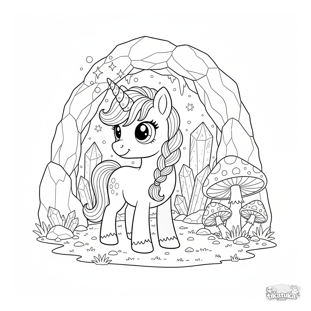 Página para colorir difícil para crianças 8-12 anos: um pônei unicórnio mágico com crina trançada guarda a entrada de uma caverna de cristal cintilante. Cristais brilhantes, cogumelos e poeira mágica.