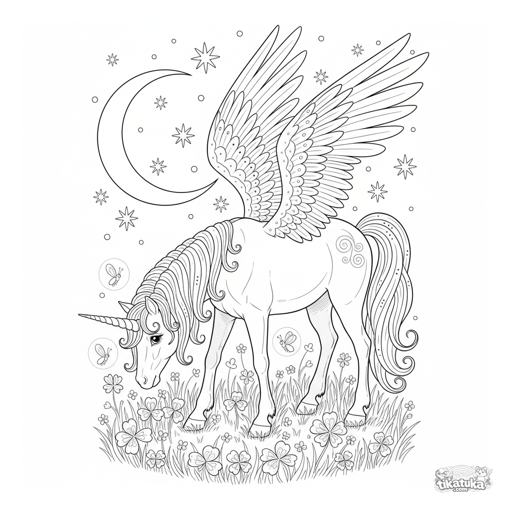 Página para colorir difícil de um pônei unicórnio realista com asas emplumadas pastando em um campo ao luar. Para crianças de 8-12 anos.