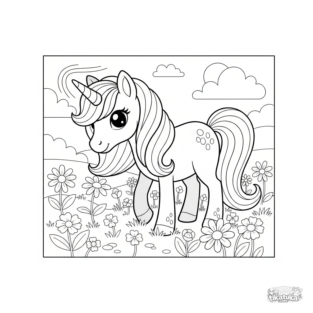 Página para colorir para meninas de 4-6 anos: um pônei unicórnio mágico com crina arco-íris pastando em um prado encantado.