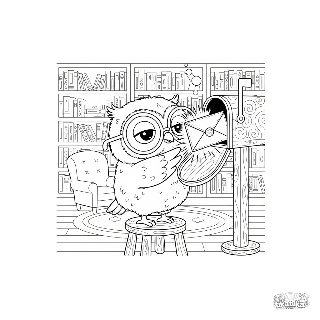 O Corujinho Oof retira um envelope misterioso de uma caixa de correio na biblioteca. Baixe, imprima ou pinte online esta cena curiosa!