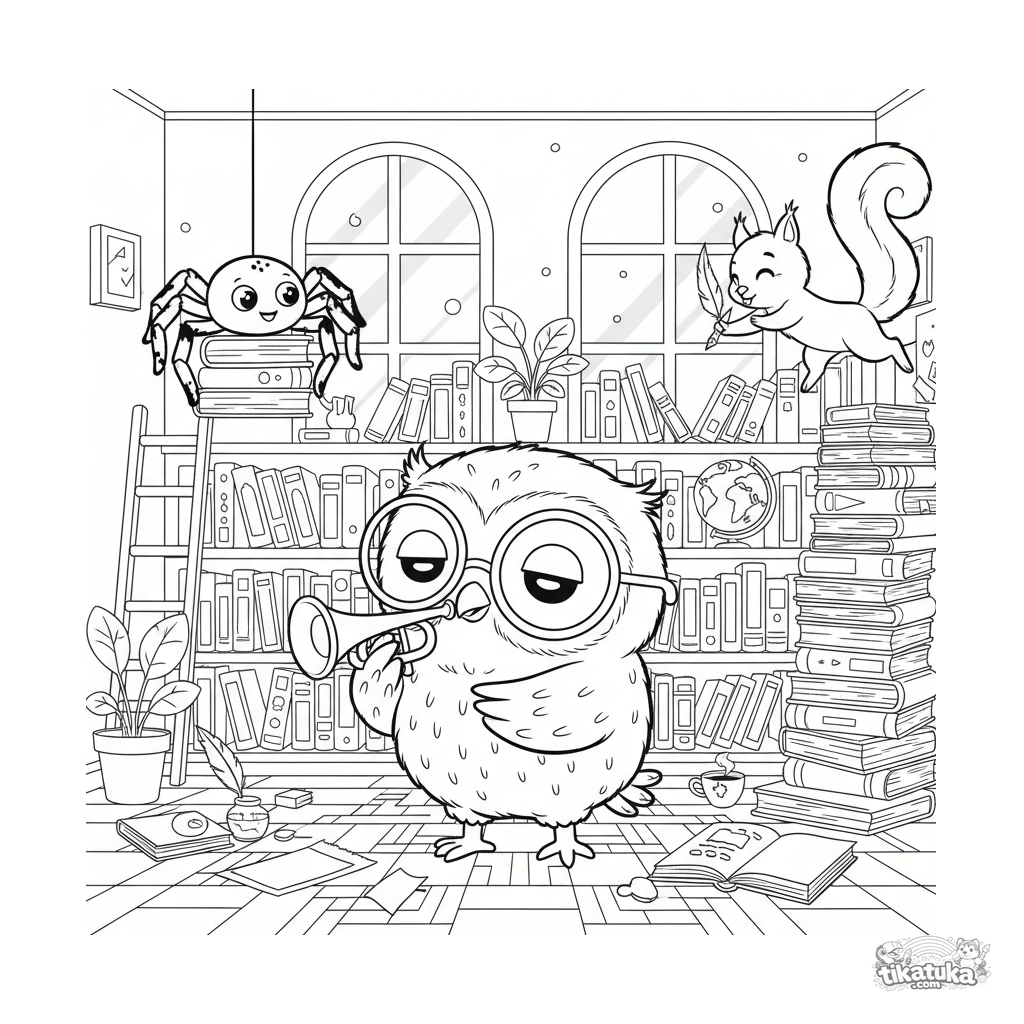 Corujinho Oof toca trombeta na biblioteca, enquanto aranha e esquilo chegam para ajudar. Baixe, imprima ou pinte online esta cena de trabalho em equipe!