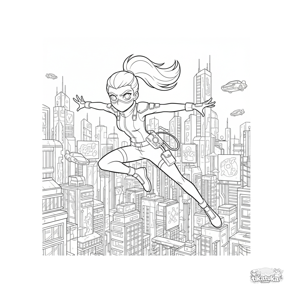 Página para colorir anime dinâmica: um aprendiz de ninja faz parkour pelos telhados de uma cidade cyberpunk. Cena de ação complexa para 10-12 anos.