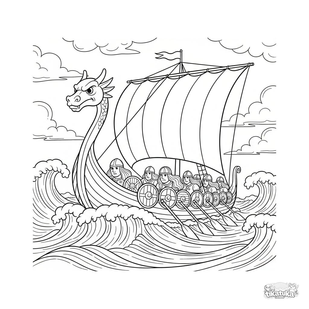 Página para colorir para crianças de 7 a 9 anos: um navio viking com proa de dragão navega em mar tempestuoso. Guerreiros remam, vela ondulando.