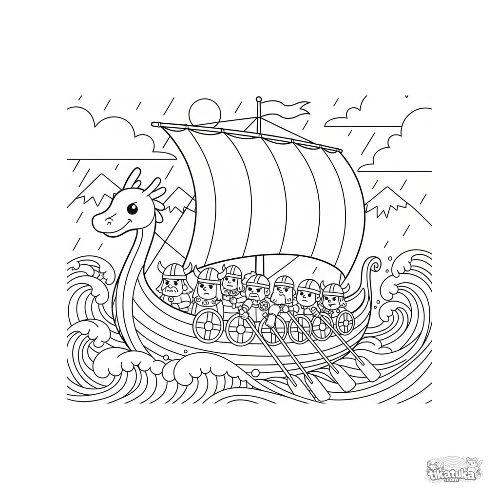 Página para colorir para crianças de 4 a 6 anos: um poderoso navio longo viking navegando por um fiorde tempestuoso.