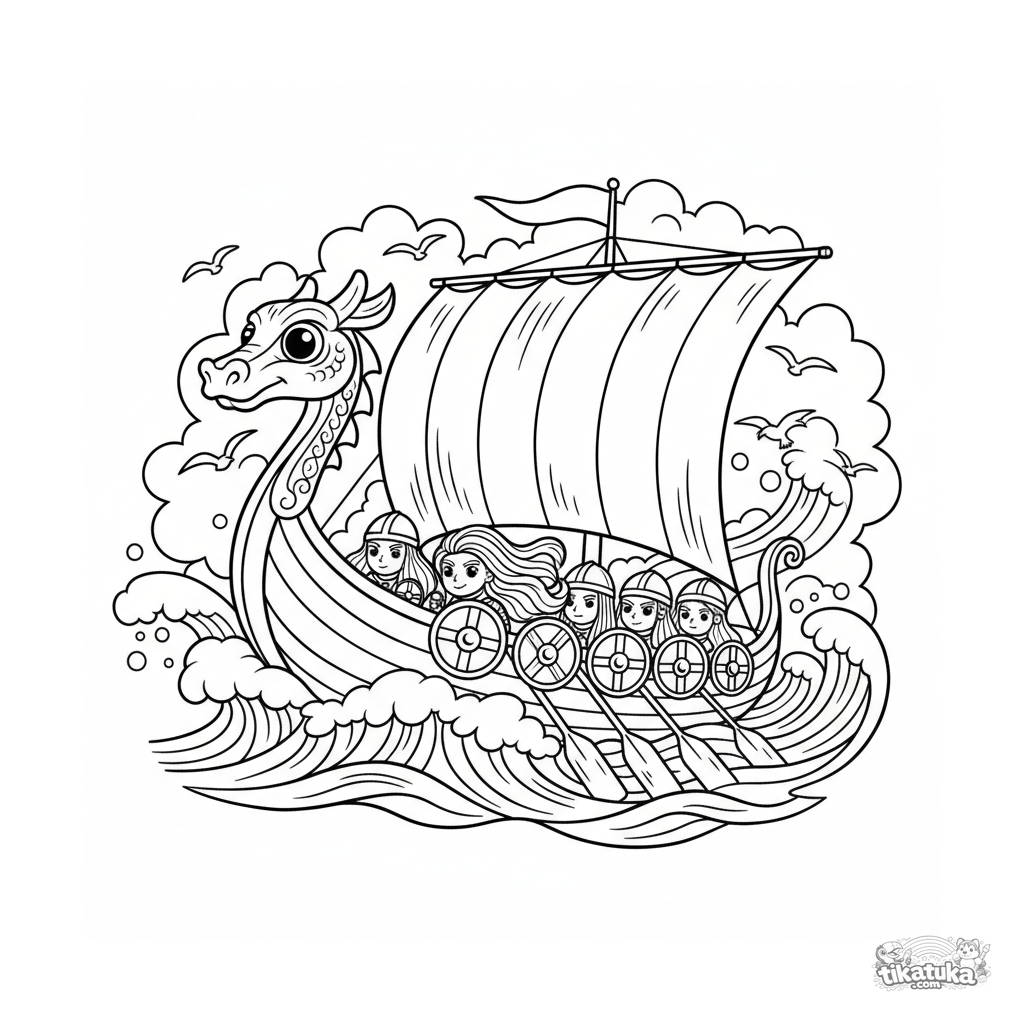 Página para colorir para pré-adolescentes de 7-9 anos: um feroz navio viking navega em um mar tempestuoso. Cena dinâmica no estilo de desenho animado dos anos 80.