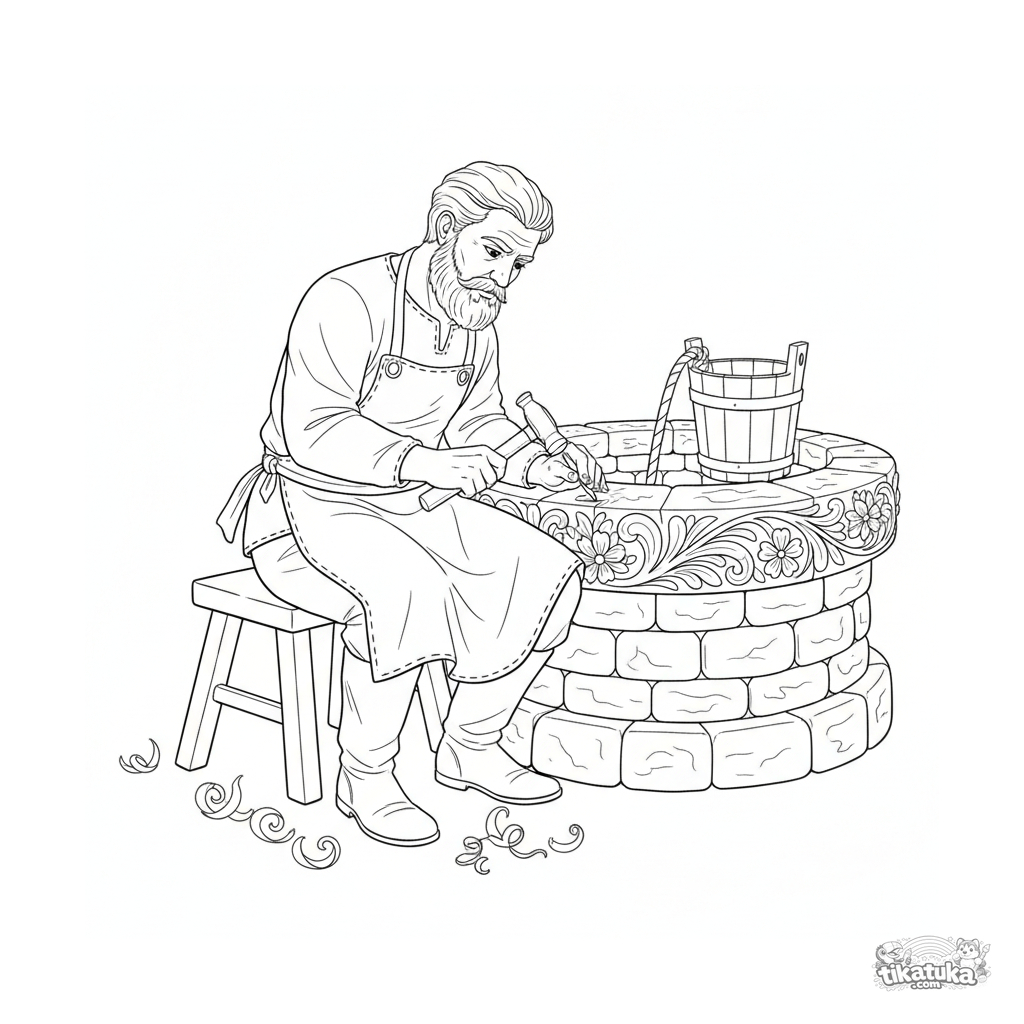 Página detalhada para colorir para crianças mais velhas 10-12: um mestre entalha um padrão no poço de água viva. Representação realista de ferramentas e processo.
