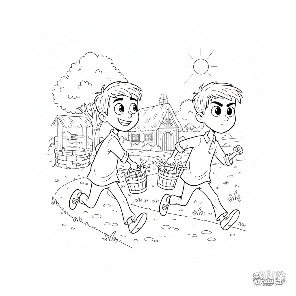 Página para colorir para crianças 4-6: dois meninos da vila competem brincando enquanto carregam baldes de água viva do poço. Cena dinâmica em estilo cartoon dos anos 90.
