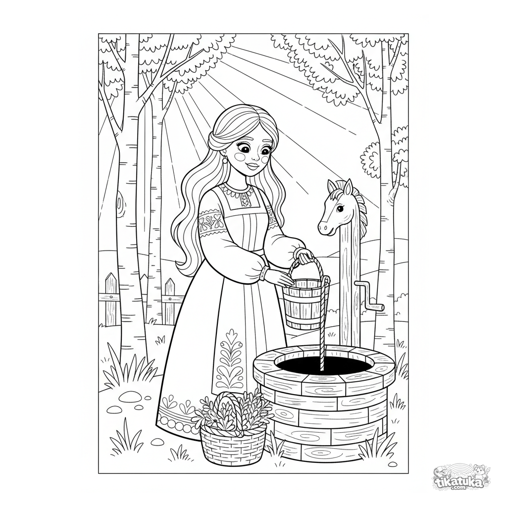 Página para colorir para crianças de 7-9 anos: uma menina em traje folclórico no poço de água viva. Cena folclórica tradicional com detalhes: balde, poço esculpido, cesta.