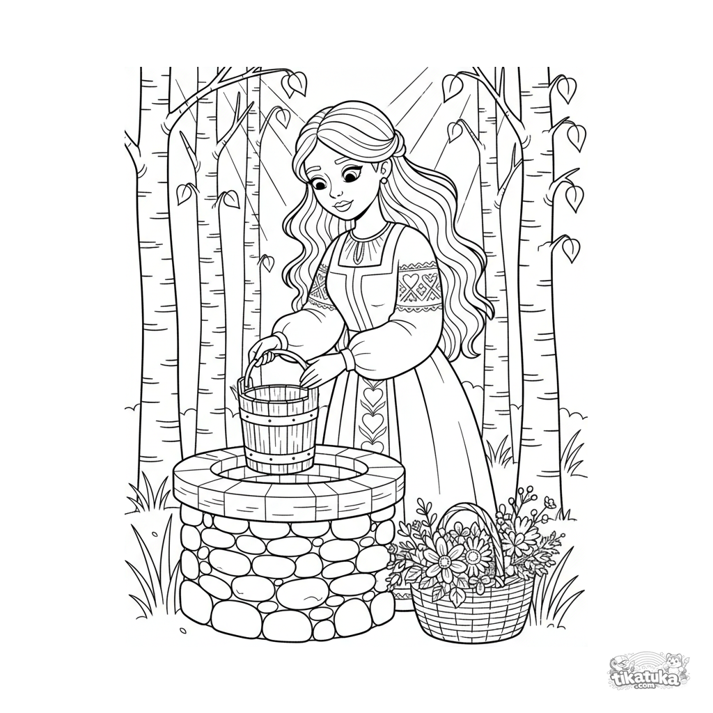 Página para colorir para crianças 7-9: uma menina em traje folclórico tira água de um poço mágico. Cena no estilo lubok russo.