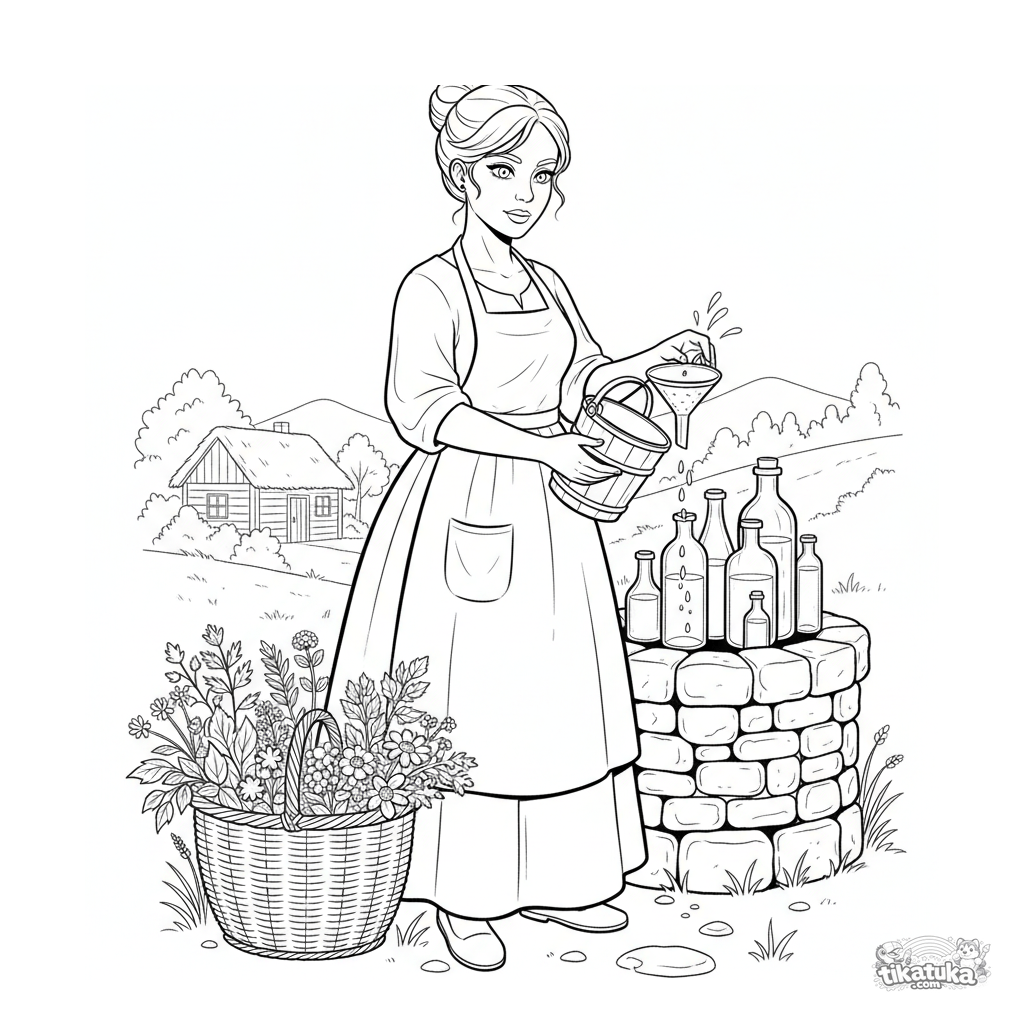 Página para colorir para crianças 7-9: uma herbalista da aldeia coleta água viva do poço para seus remédios. Estilo de esboço aquarela, cena centralizada.