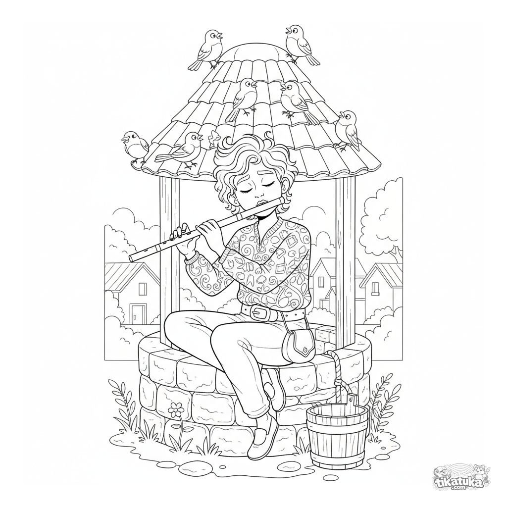 Página para colorir intrincada para crianças mais velhas 10-12: um músico toca flauta junto ao poço enquanto pássaros se reúnem. Cena detalhada no estilo guia de campo.