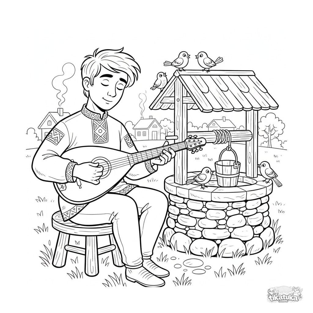 Página para colorir para crianças de 7-9 anos: um músico da aldeia toca o gusli junto ao poço de água viva. Estilo esboçado, linhas expressivas.