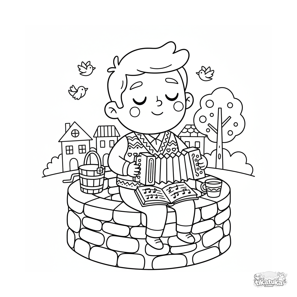 Página para colorir para crianças 4-6: um músico da aldeia com acordeão canta no poço. Estilo de brinquedo de madeira, cena centralizada.