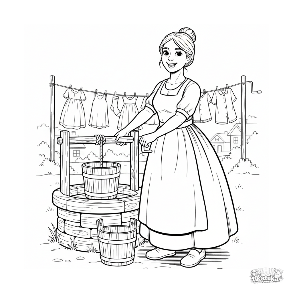 Página para colorir para crianças 4-6: uma mulher da aldeia tirando água de um poço. Estilo gravura em linóleo, formas contrastantes ousadas, vida folclórica cotidiana.