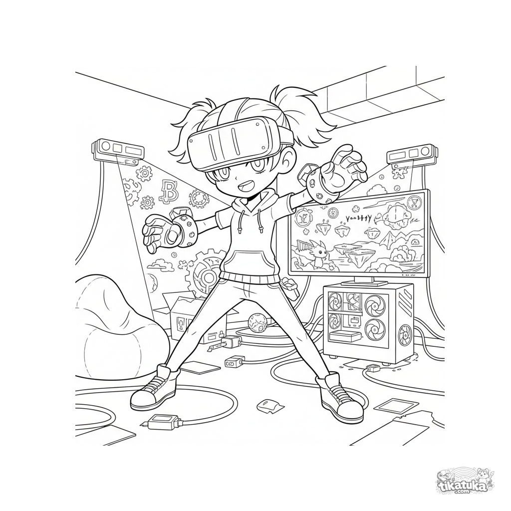 Página para colorir para crianças de 10-12 anos: um jogador totalmente imerso em realidade virtual em um porão especialmente equipado. Cena energética em estilo anime shonen leve.